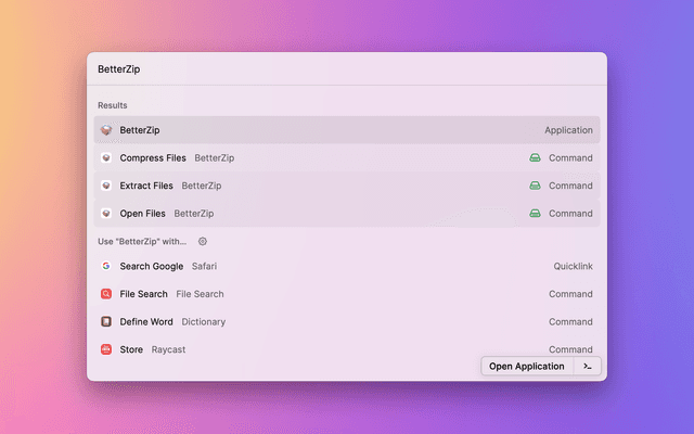 Compress and extract selected items in Finder with BetterZip via Raycast.
