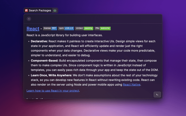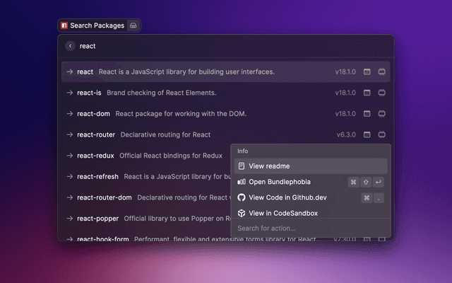 Raycast extension to search for npm packages using npms.io