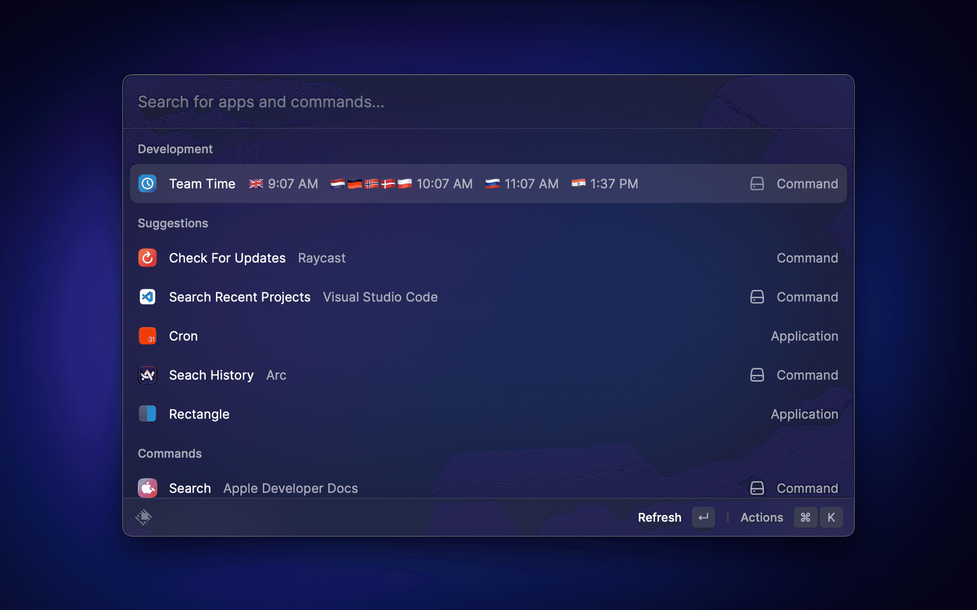 Pro tip: Favorite the command in Raycast. This way, you see your team's time zones whenever you toggle the app.